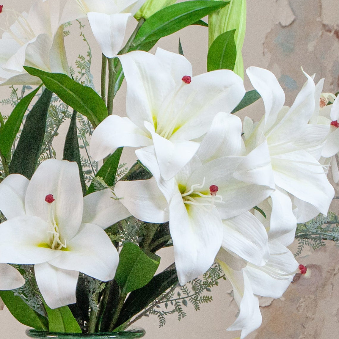 Artificial Casablanca Lilies and Lace Ferns in a Large Recycled Glass Decanter Vase