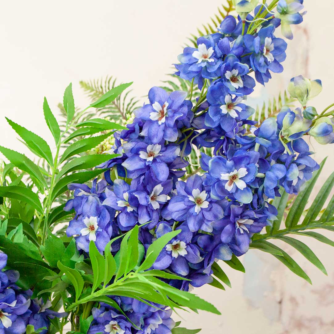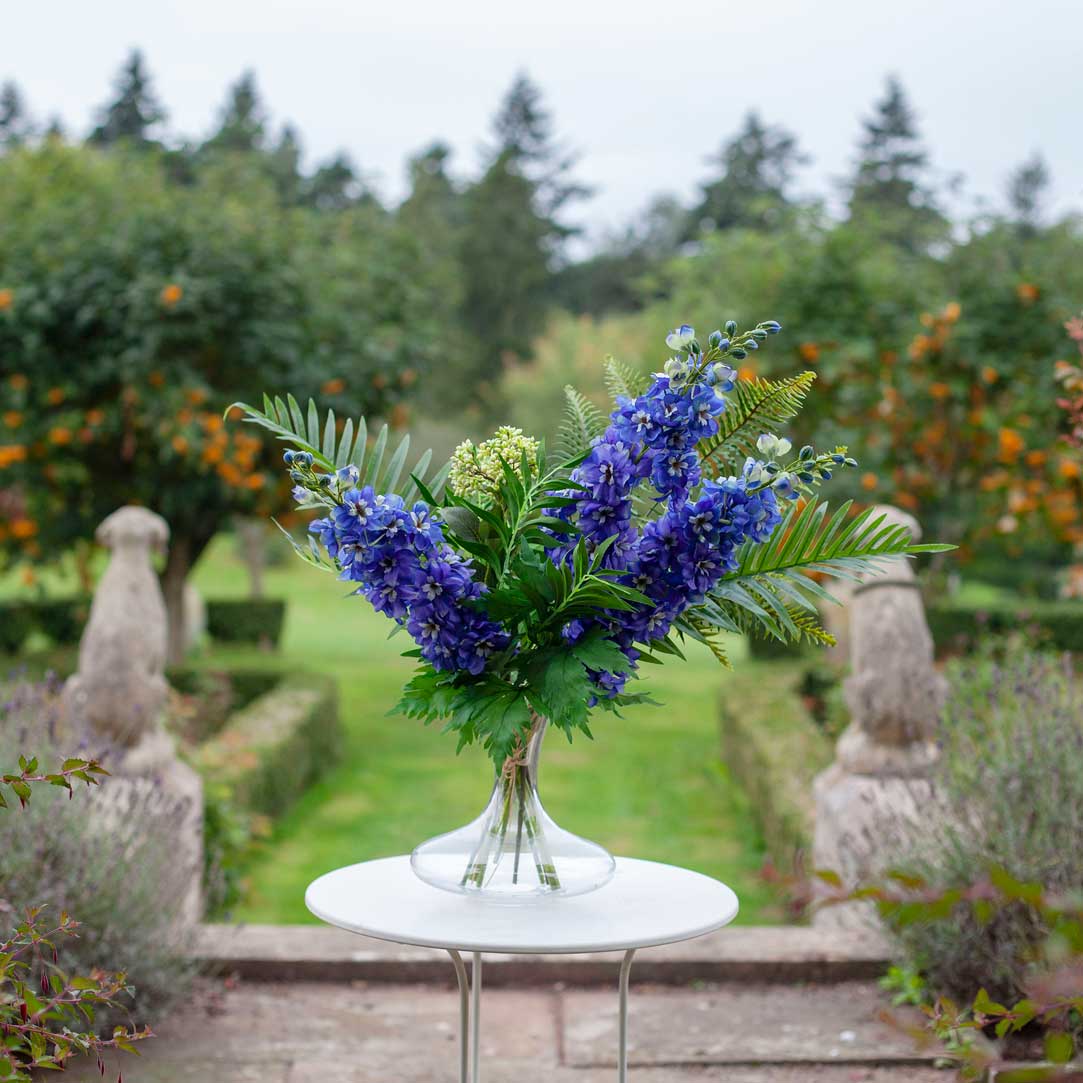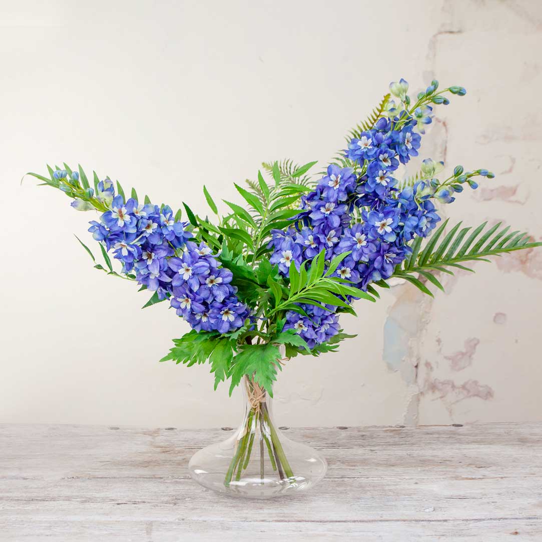 Delphiniums and Foliage In A Decanter Vase