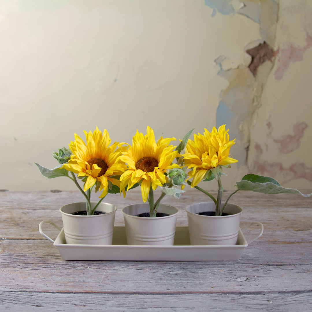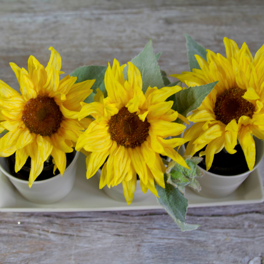 With the Set of Three Potted Sunflowers in a Tray, you’re adding a piece that captures the warmth of summer. The quality materials ensure lasting beauty, and the convenient, rustic tray brings easy elegance to the arrangement. These charming, maintenance-free blooms make a unique, eye-catching display and are always ready to lift the spirits. Brighten someone’s day with these timeless, joyful sunflowers.