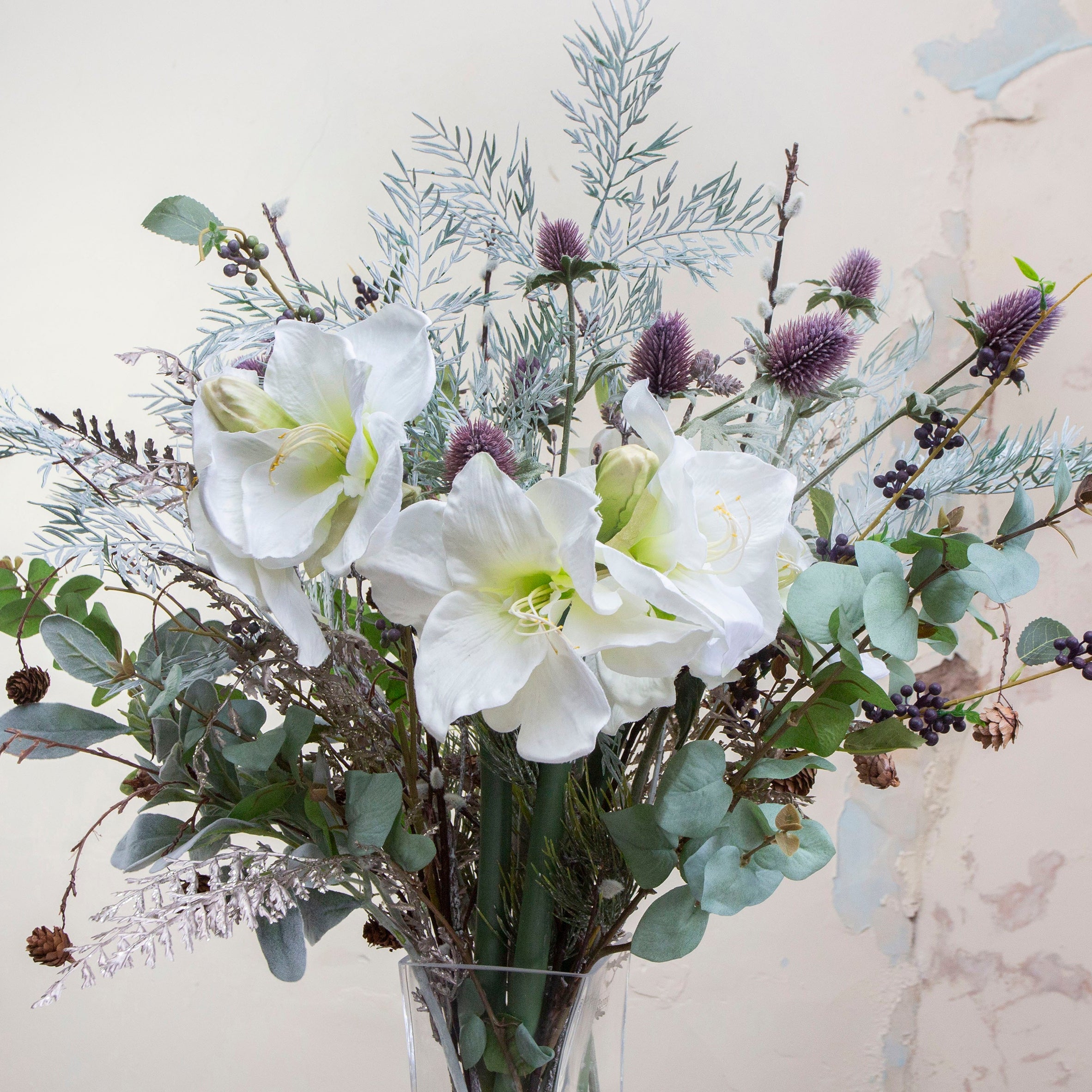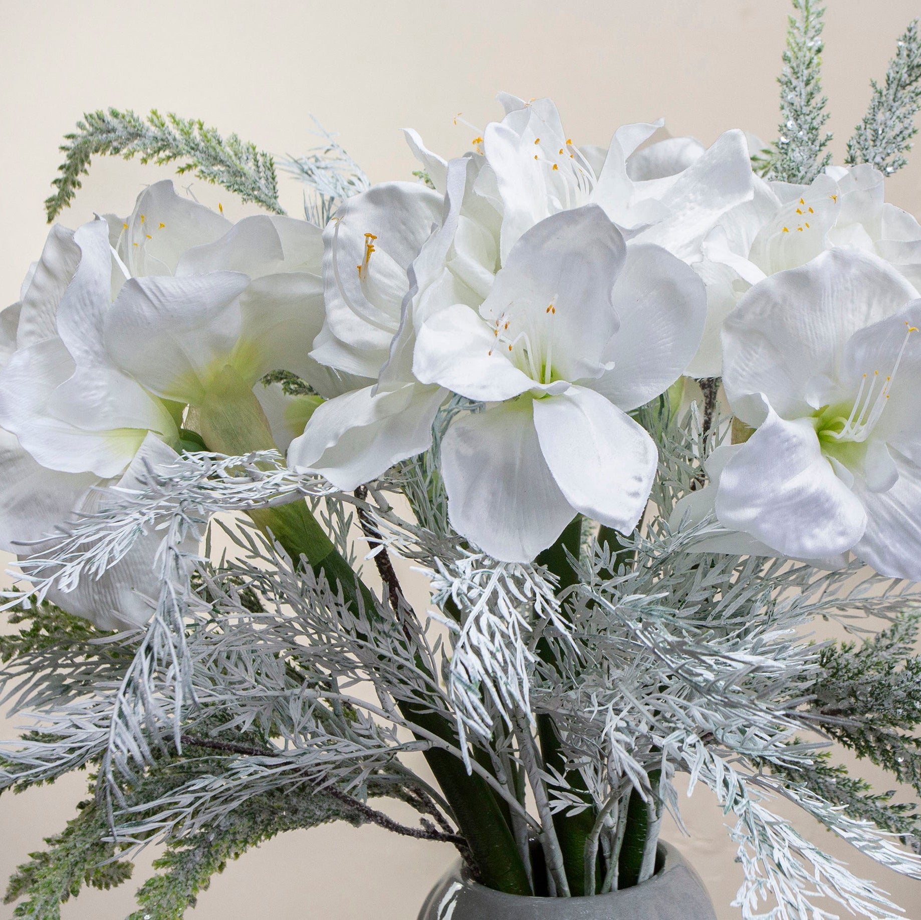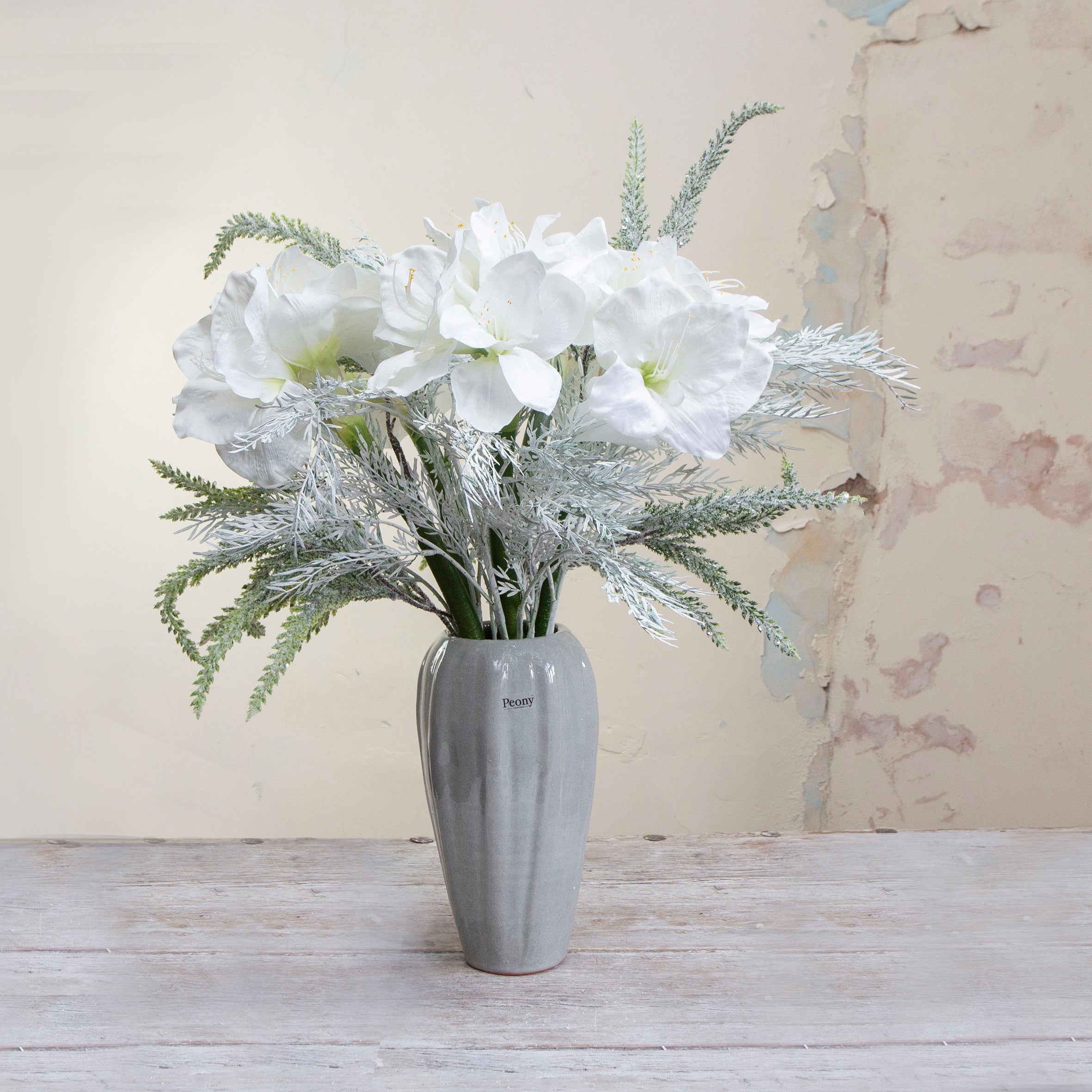 Artificial Amaryllis with Sparkle Pine in Grey Ceramic Vase