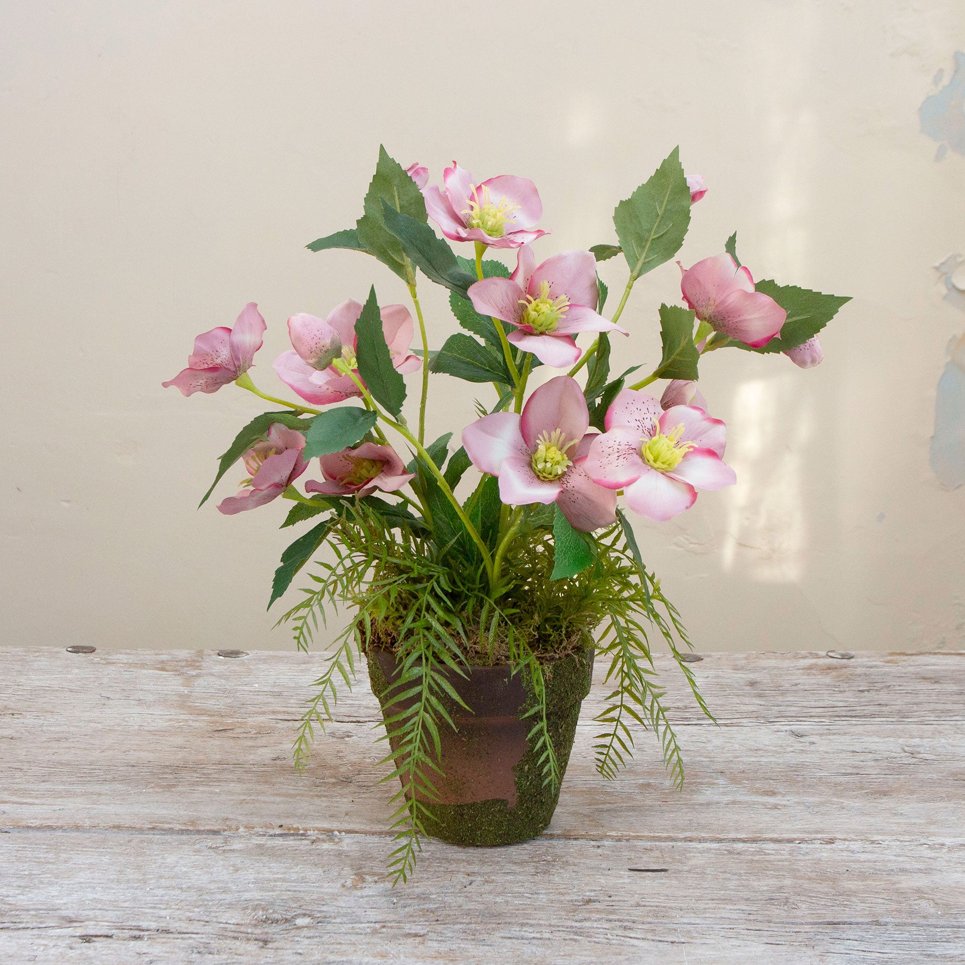 Bring natural, woodland-inspired charm into your home with these faux hellebore flowers, beautifully arranged in a rustic moss-covered pot. Planted with real moss and complemented by realistic faux foliage and willow stems, this arrangement available on a pink and white option, captures the quiet elegance of early spring garden planting—without any maintenance.