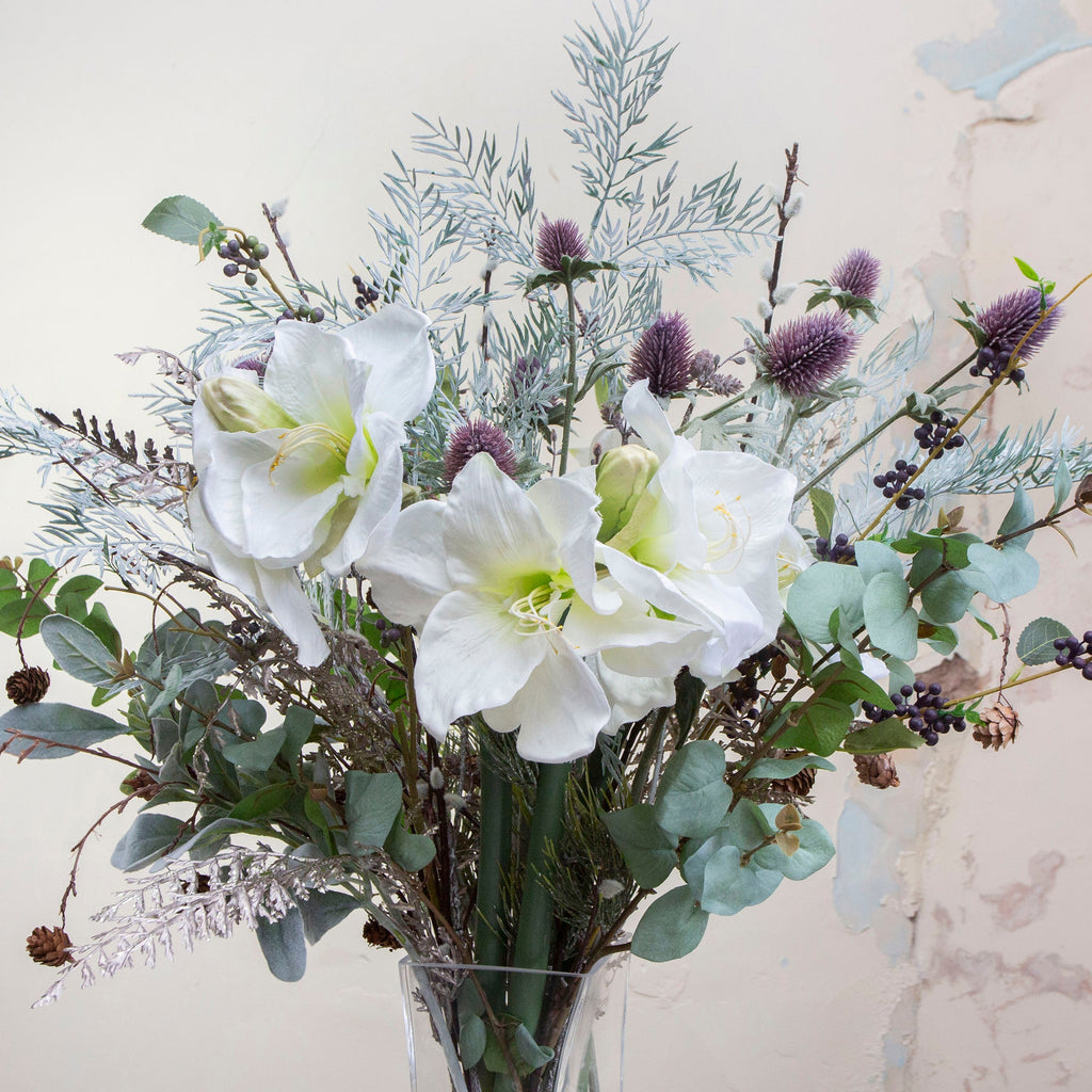 Indulge in artisanal floristry with this bespoke faux arrangement—a couture masterpiece designed for those who refuse to compromise on elegance. Luminous white amaryllis takes centre stage, gracefully surrounded by tumbling pine cones, lush foliage, and delicate thistle accents. Presented in an exquisite twisted glass vessel, this singular creation offers permanent beauty without the fuss of watering or wilting. Crafted with meticulous attention to detail, it's the perfect statement piece for discerning collectors seeking luxury décor that transcends seasonal trends and maintains its pristine allure year-round.