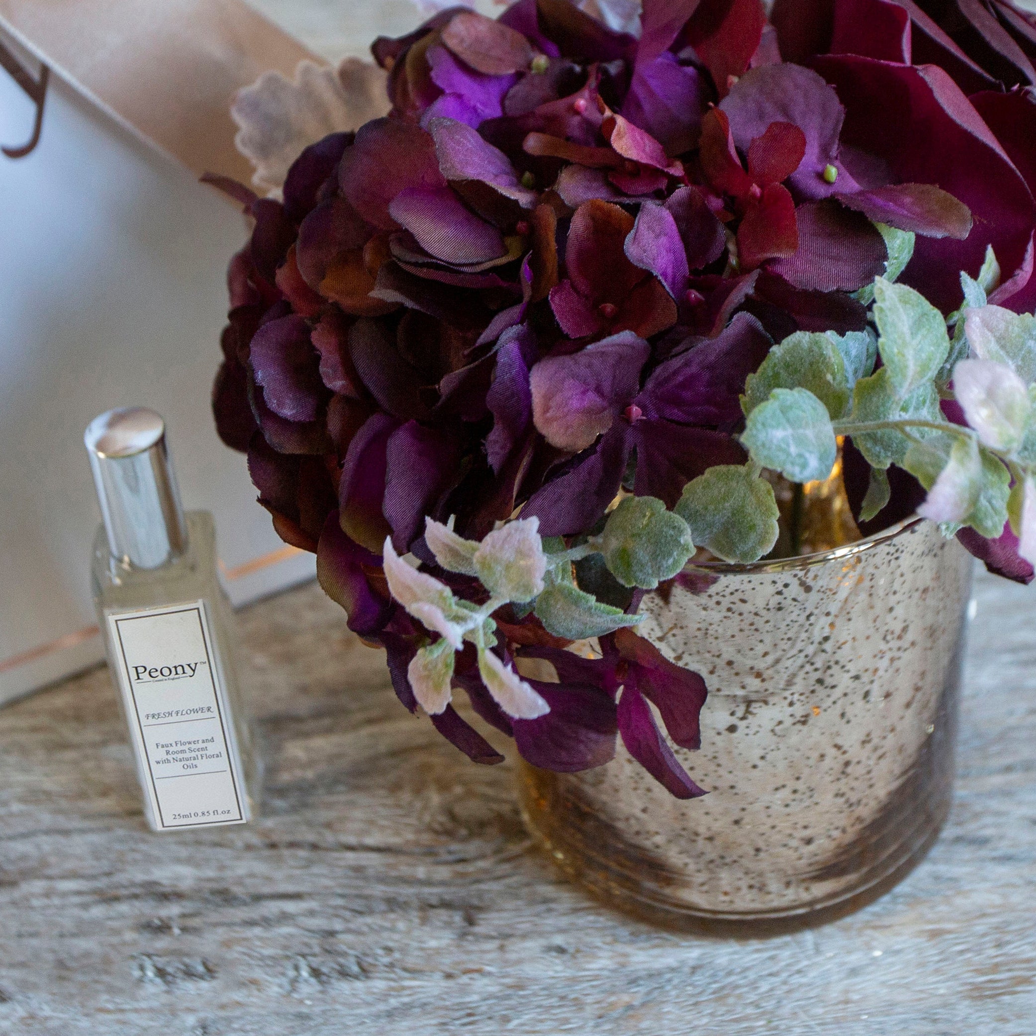 Artificial Roses, Hydrangeas, Foliage, in a Mercury Glass Vase - Gift Bag & fragrance
