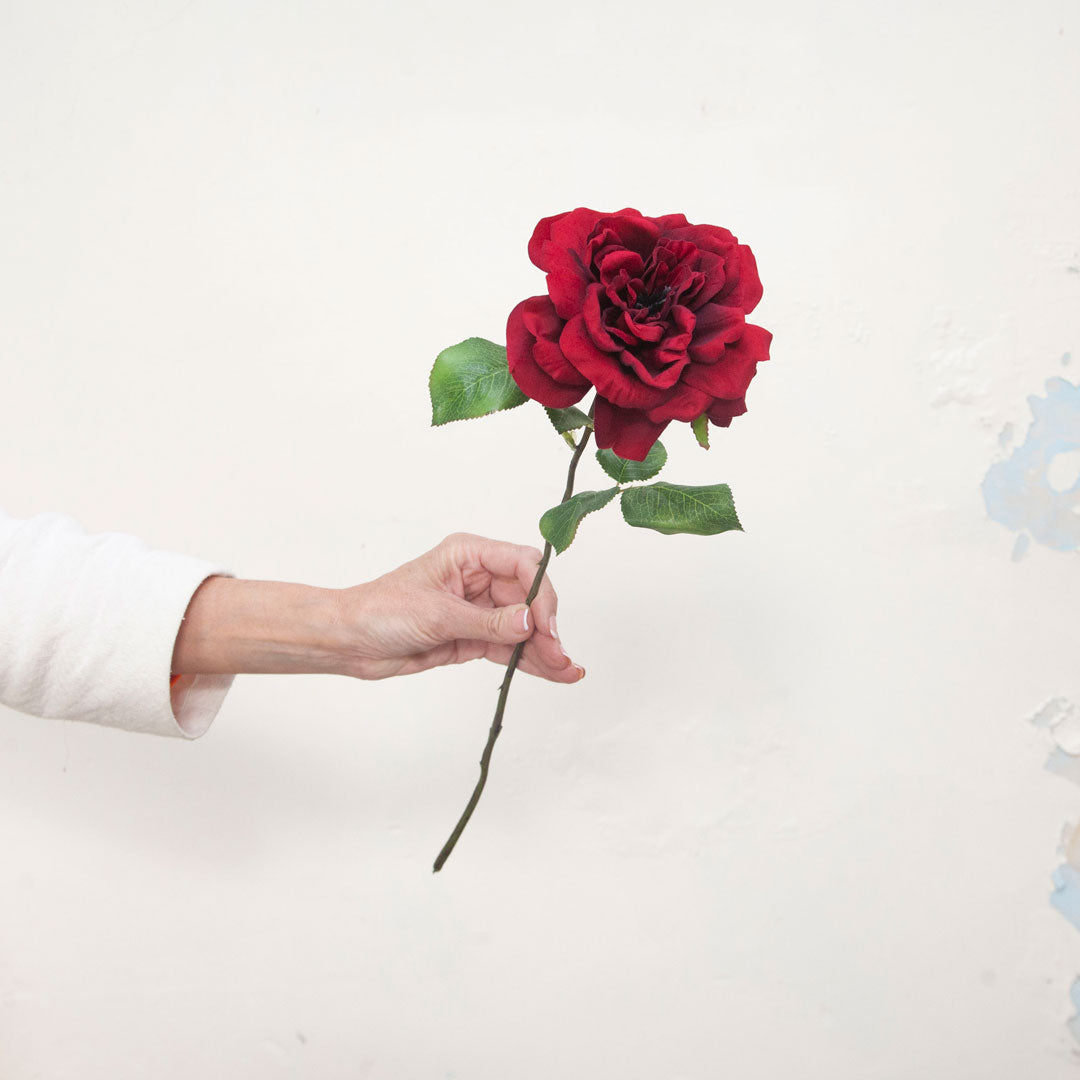 A long stemmed, deep red rose with a velvety touch. A stunning old English variety with leaves.