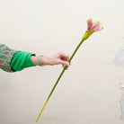 An elegant long stemmed calla lily. The petals are a pretty green on the outer petals and then the centre is pale pink. Displayed in a tall glass vase for that beautiful display to love in your home.