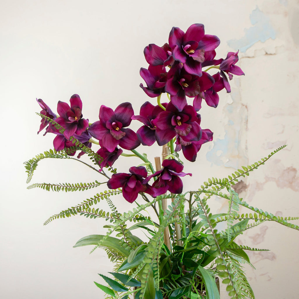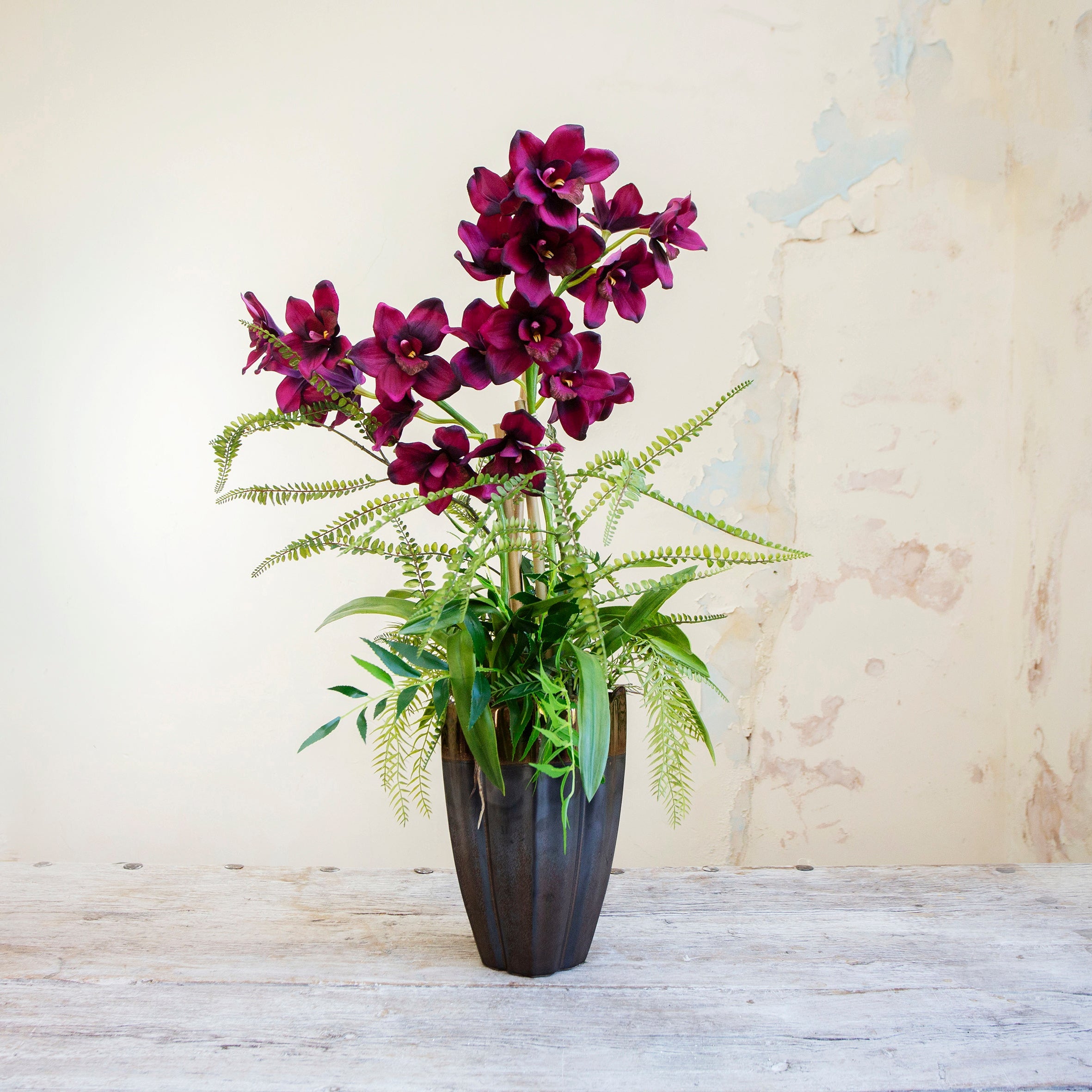Add a touch of timeless sophistication to your home with this elegant artificial  orchid arrangement, featuring rich burgundy faux cymbdium orchid blooms paired with realistic ferns and lush green foliage. Expertly arranged in a stylish metallic ombré vase, this eye-catching display brings lasting beauty without the hassle of watering or maintenance.