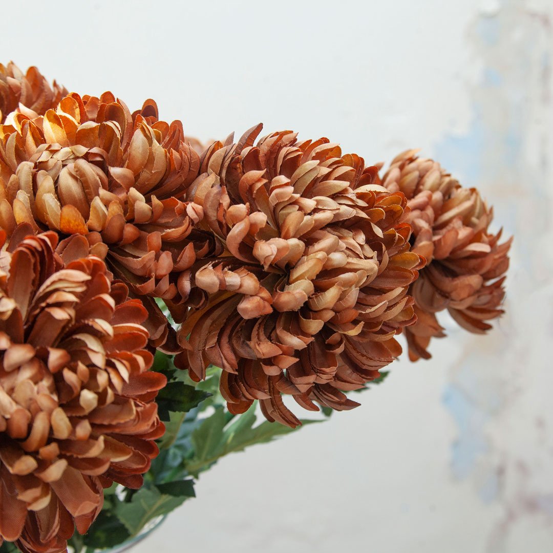 This faux rust-coloured chrysanthemum stem features densely layered petals with a rich, warm tone and realistic green foliage. Designed to replicate the natural structure and depth of a real chrysanthemum, it offers a lifelike finish with long-lasting appeal.