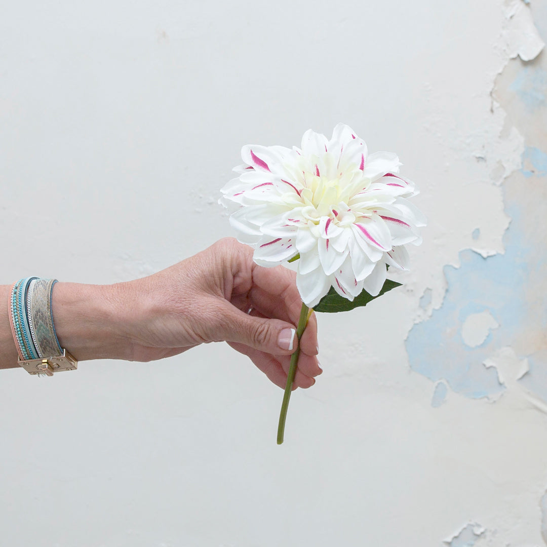Available in bridal white with a fuchsia stripe and pink with a fuchsia stripe, this artificial dahlia is perfect for weddings, interior styling, retail displays, and seasonal arrangements. Its realistic appearance and versatile colour options make it a timeless addition to any floral collection.