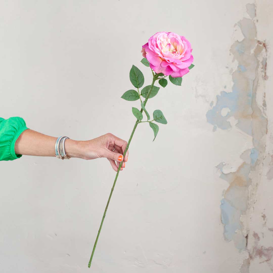 The gorgeous Sophia rose in dark pink, on a long stem with leaves, is one of Julie's favourites. The Sophia rose has been copied from the gardens at Ruckley where the rose grows in one of the main flower beds. These roses will add a gorgeous touch of vibrant colour to your interior.