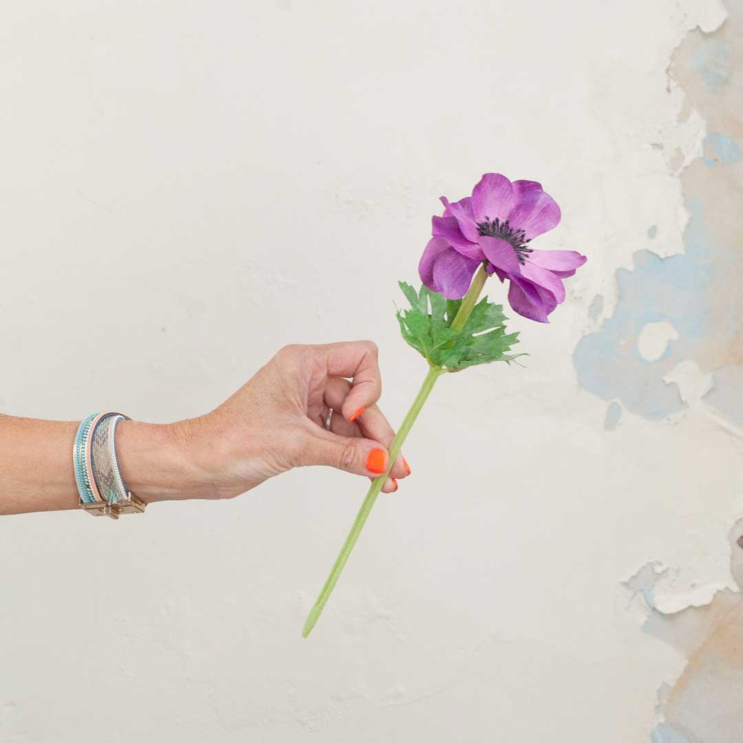 A stunning bright purple anemone with dark centre. These will add a real pop of colour to your interior.