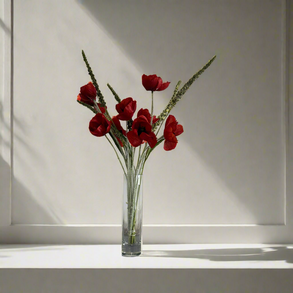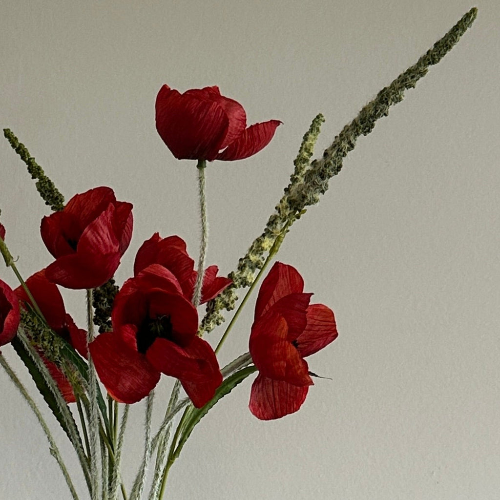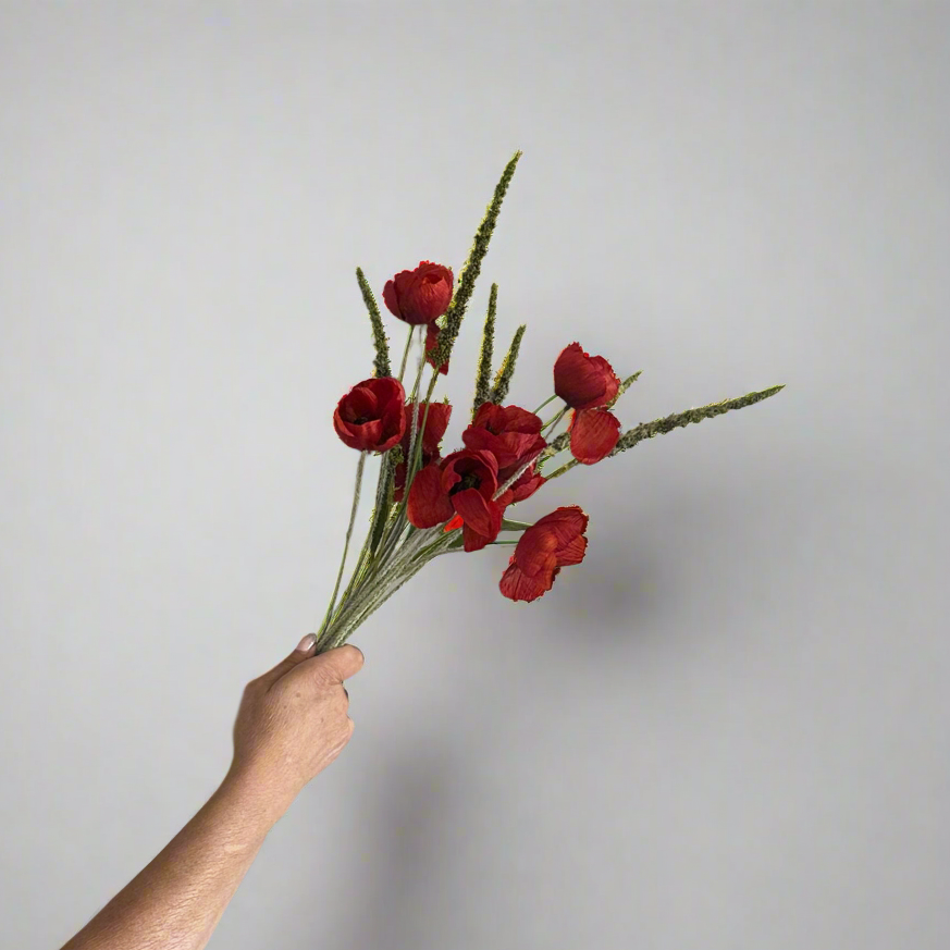 This Poppies and Grass Seed Bunch is a beautiful faux bouquet, perfect for Remembrance Day or any special occasion. The delicate poppies and grass seeds add a touch of elegance and serve as a meaningful tribute to those who have served. Display this bundle with pride in any setting.