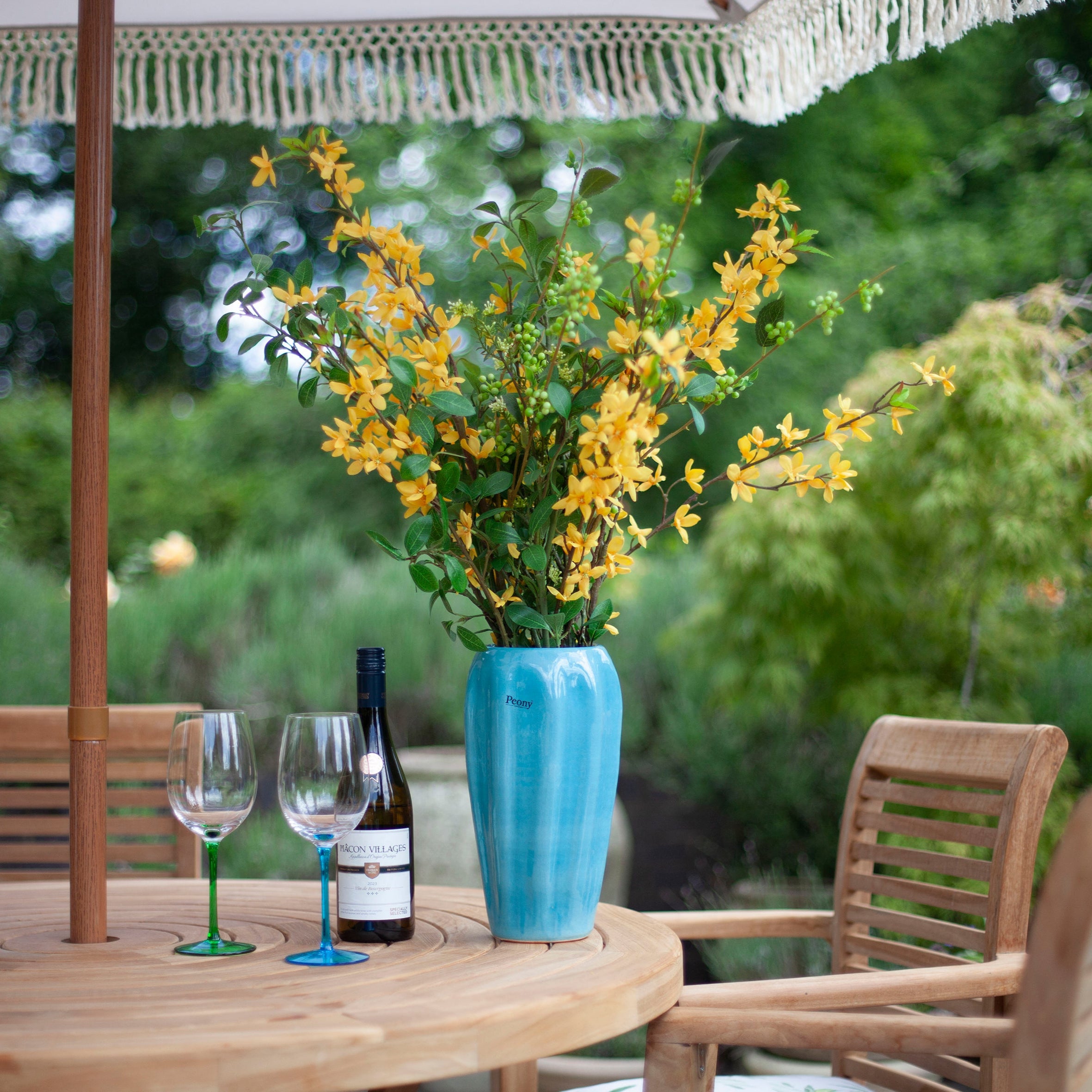 The tall, arching stems of forsythia are arranged to echo the natural movement of the flower in early spring, creating height, drama and a sense of fresh seasonal renewal. Paired with a smooth, deep-blue glazed vase, the composition offers a striking contrast that feels both modern and timeless.