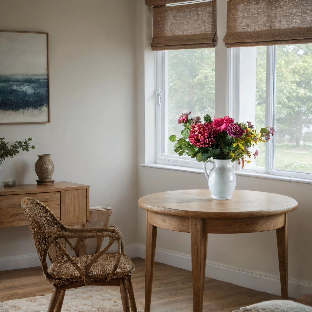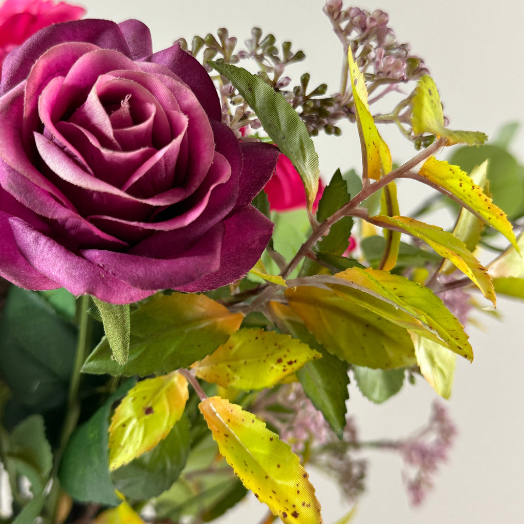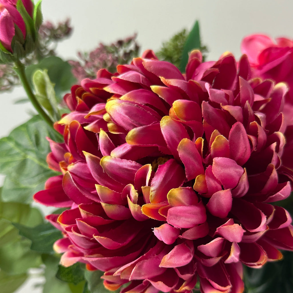 Bring timeless beauty into your space with this unique arrangement featuring magenta chrysanthemums, fuchsia dahlias, purple roses, and lush foliage, all expertly crafted as lifelike faux flowers. Presented in an elegant ceramic jug, this one-of-a-kind piece offers lasting charm without maintenance or wilting. Perfect for adding vibrant color and sophistication anywhere in your home or office, it promises to brighten your surroundings year-round with effortless style.